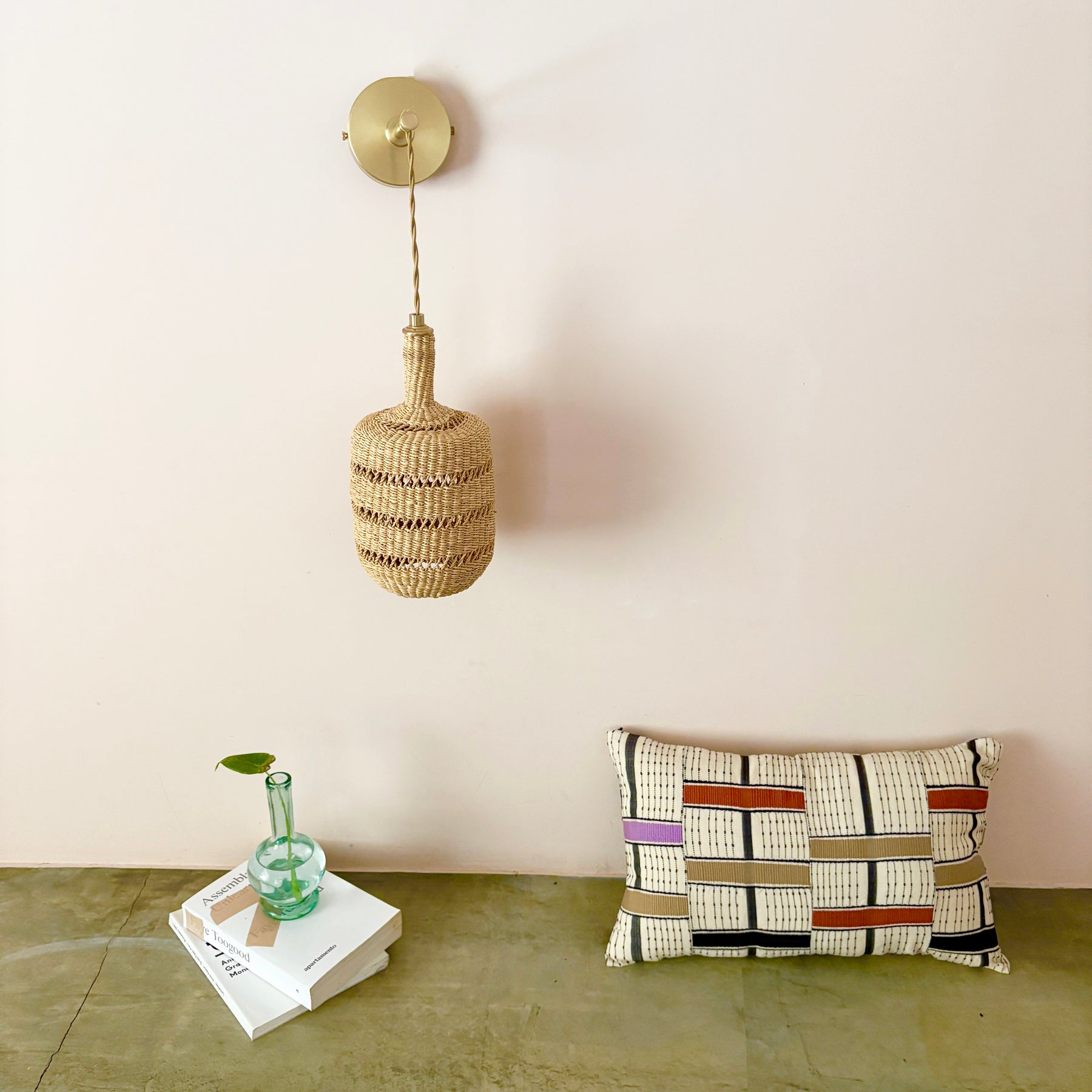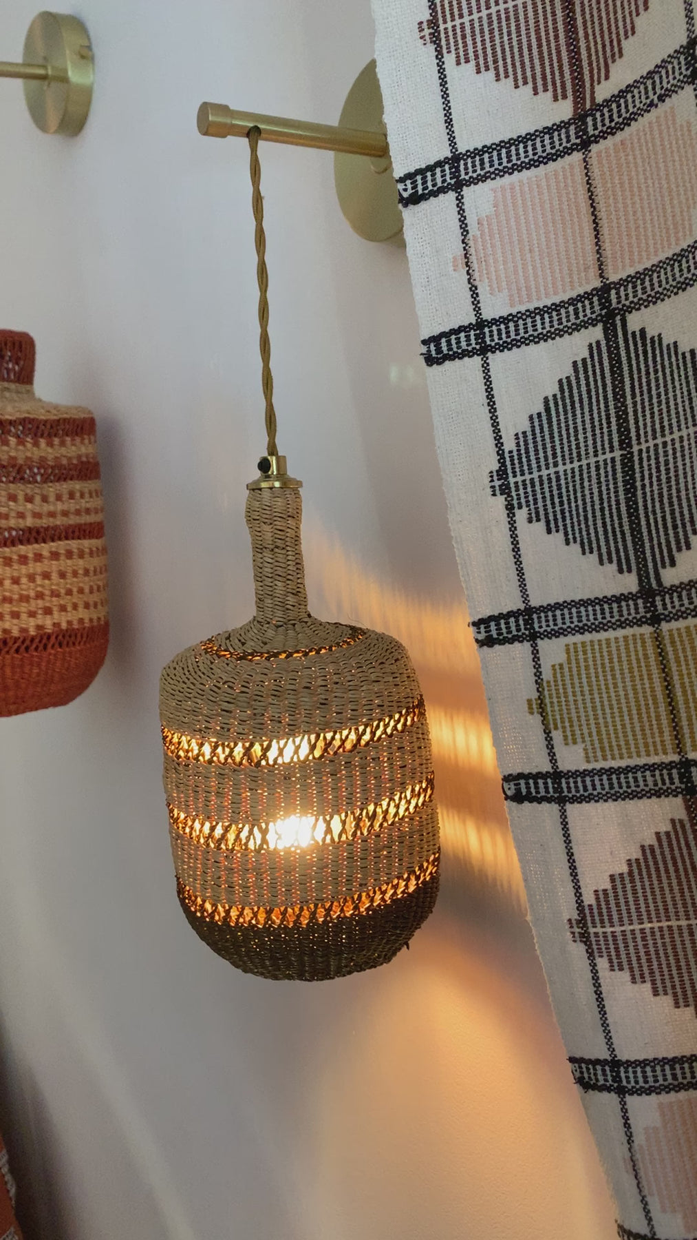 Artisan wall lamp featuring a vertical handwoven straw shade that hangs gracefully from a brass wall support. The Lantern Wall Lamp combines pendant-style elegance with soft, ambient light — ideal for bedrooms, hallways, or boutique interiors. Handmade in Ghana and finished in Barcelona by Golden Editions.