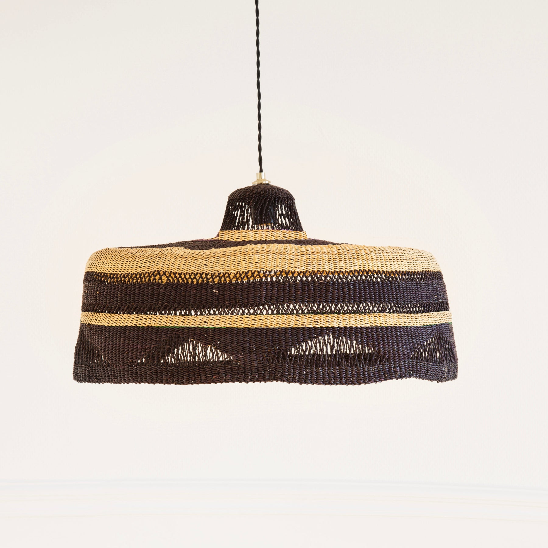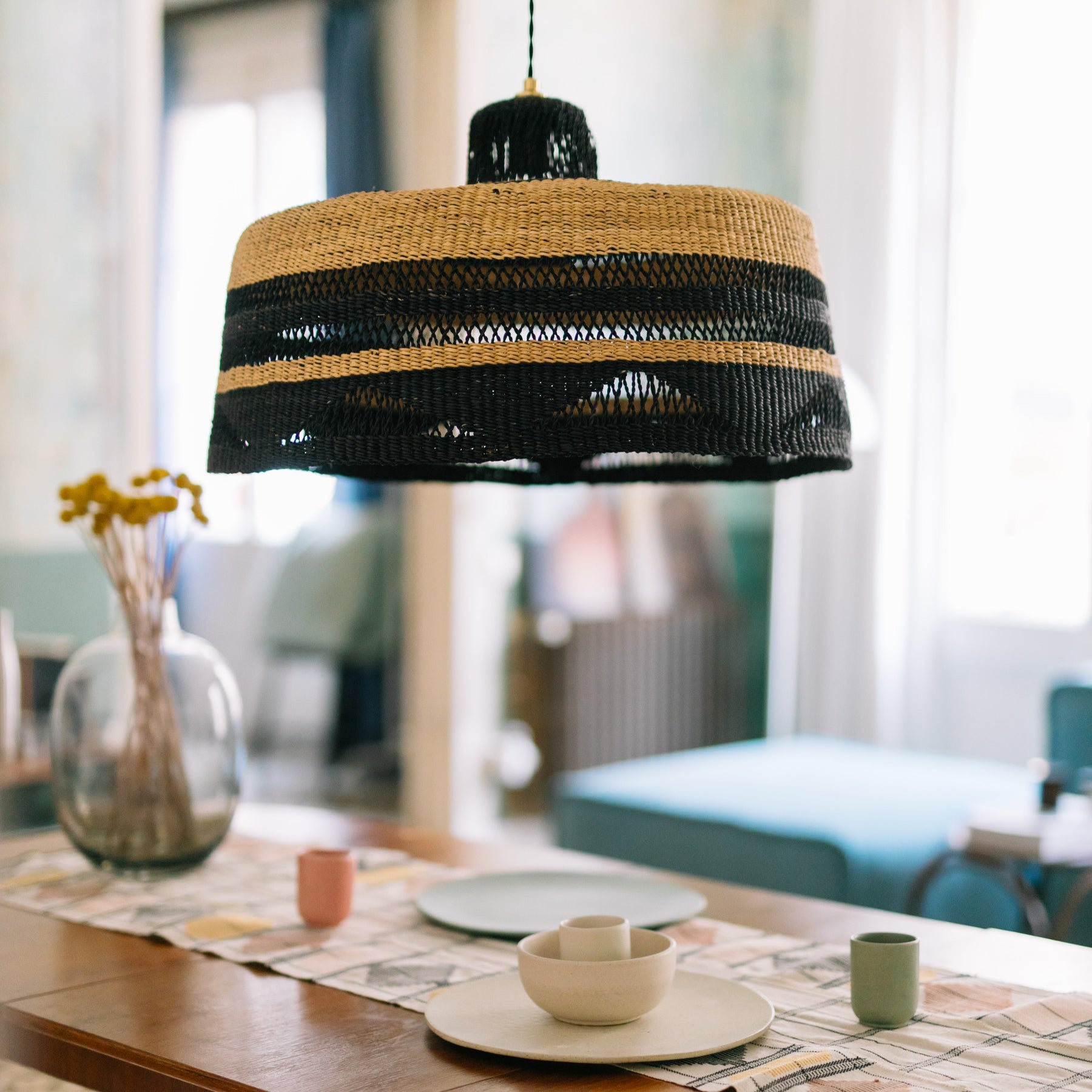 Artisan pendant lamp handwoven in natural straw with an open-weave structure of triangles and stripes. The Shadow Pendant highlights the beauty of raw material and craftsmanship, casting soft, dappled light across interiors. 100% natural and handmade in Ghana, finished in Barcelona by Golden Editions. End of line.