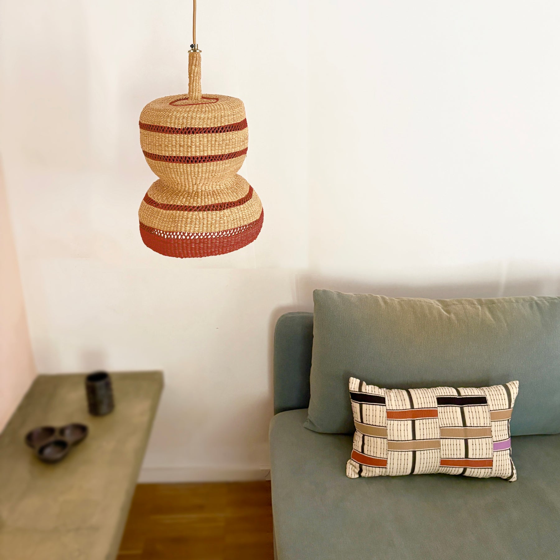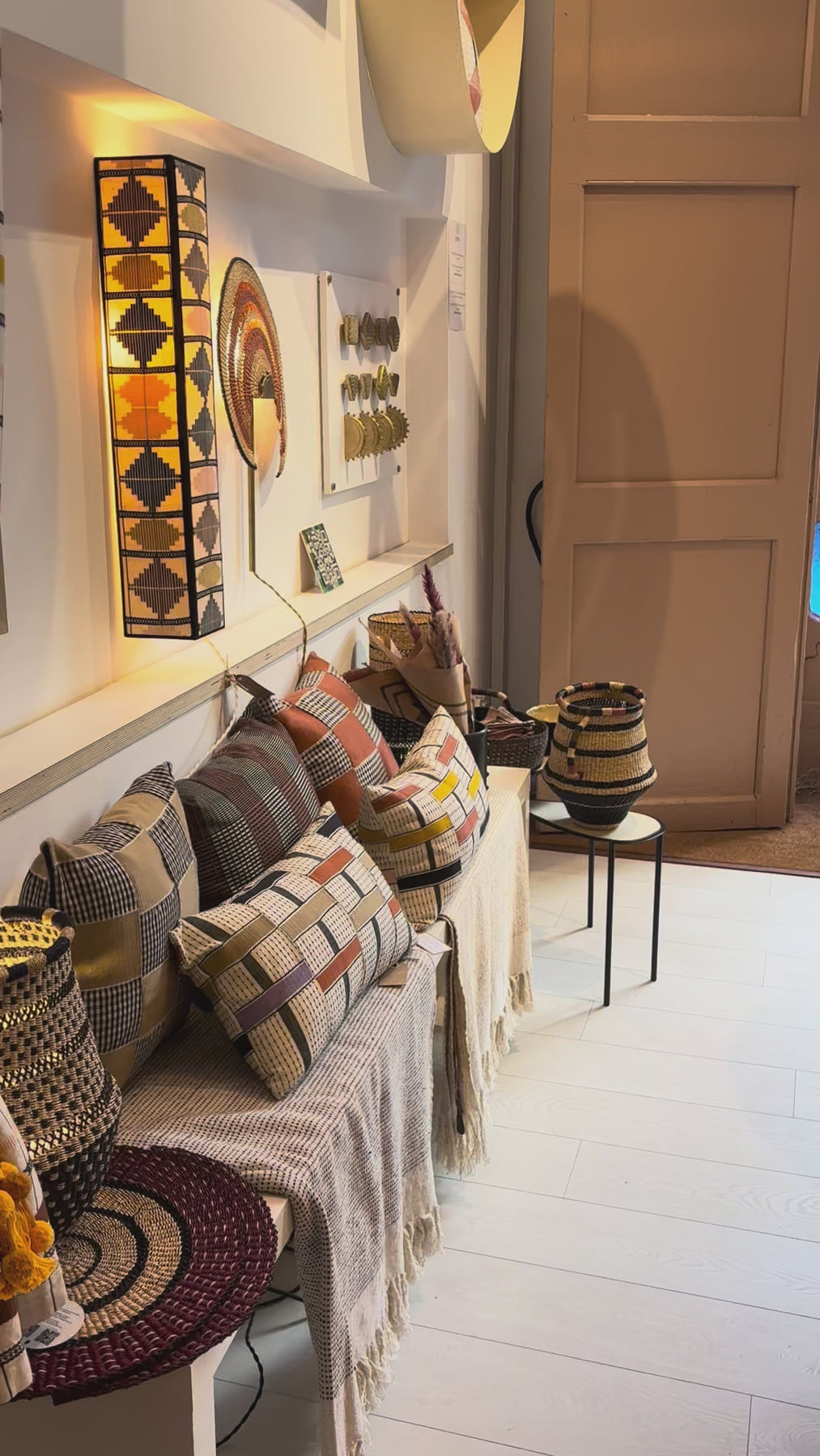 Decorative cushion crafted from handwoven Kente textile featuring a rhythmic geometric pattern designed by Golden Editions. The To + Fro Cushion brings lively colour, movement, and artisan texture to sofas, beds, or boutique interiors. Handwoven in Ghana for Golden Editions.