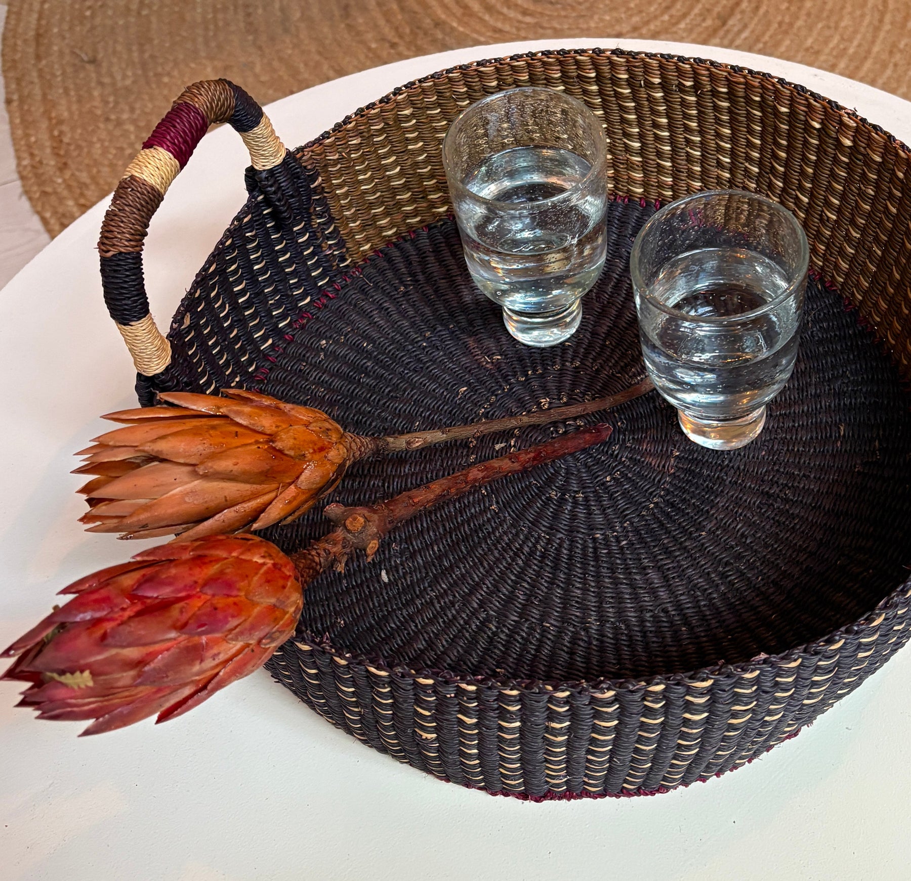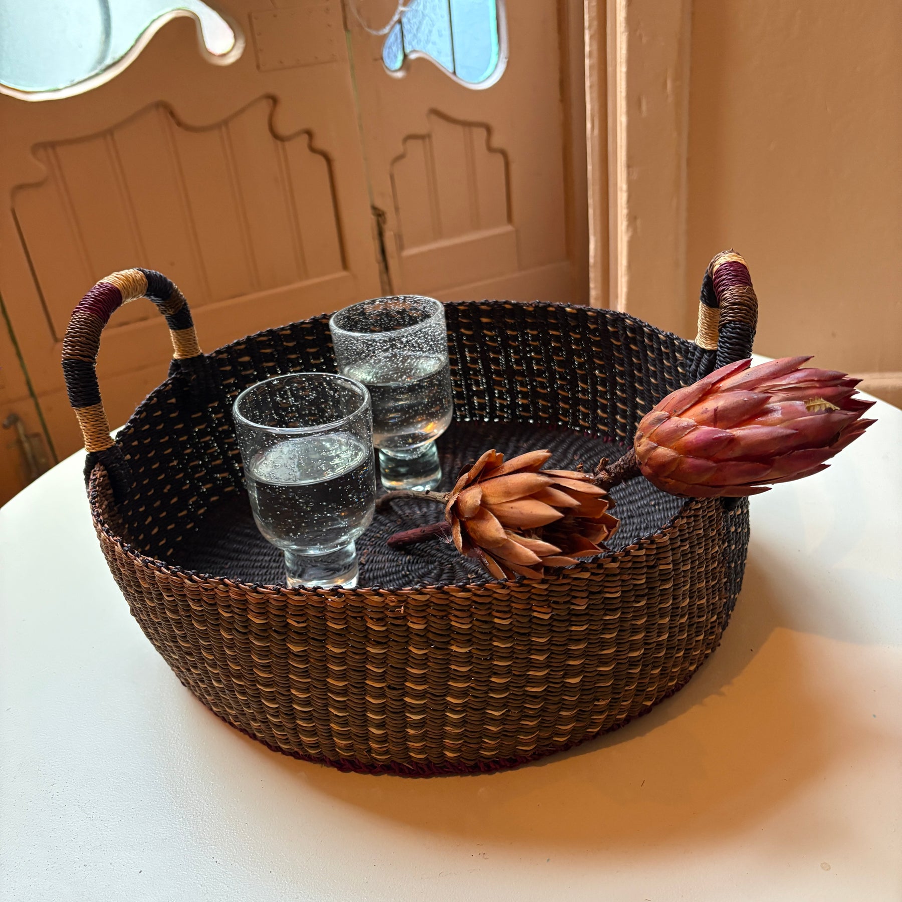 Cesta redonda con bandeja tejida a mano en paja natural en 2 colores con trama de trama discontinua. Práctica y decorativa, la bandeja Luna es perfecta para servir, guardar o exhibir, y un regalo muy especial. Hecha a mano éticamente en Ghana y terminada en Barcelona por Golden Editions.