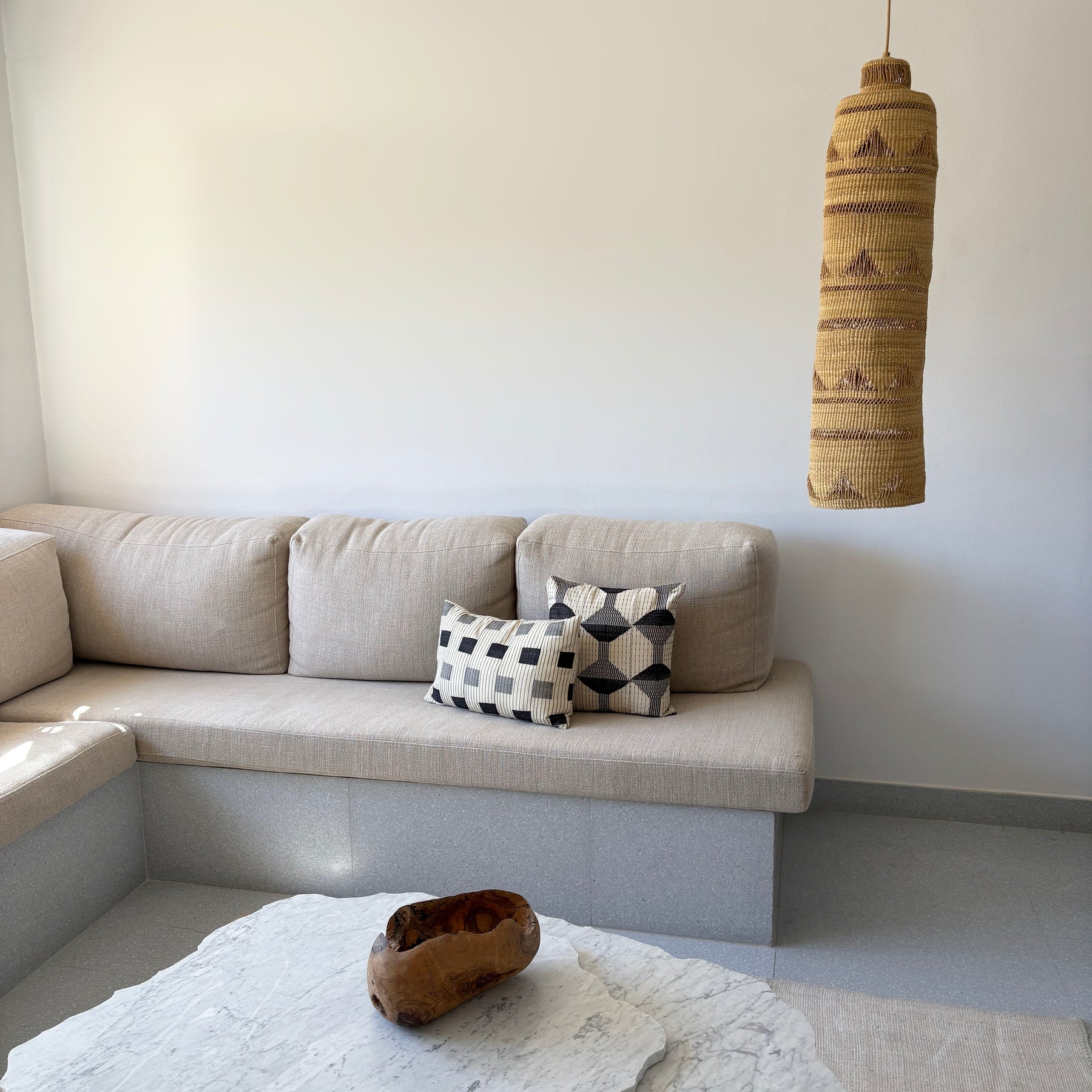 Suspension tubulaire en paille tressée, fabriquée artisanalement au Ghana. Le Shadow Tube apporte une douce lumière verticale et une texture naturelle aux intérieurs, idéal pour les couloirs, les chambres ou les boutiques. Finition soignée à Barcelone par Golden Editions.